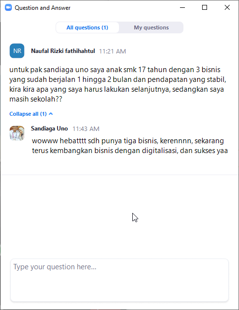 Setelah menunggu sekian menit, saya ikut dalam live Zoom dengan Menteri BUMN Erick Thohir, Pengusaha Sukses Rosan Roslani, dan Pengusaha yang juga mantan calon Wakil Presiden Sandiaga Uno.