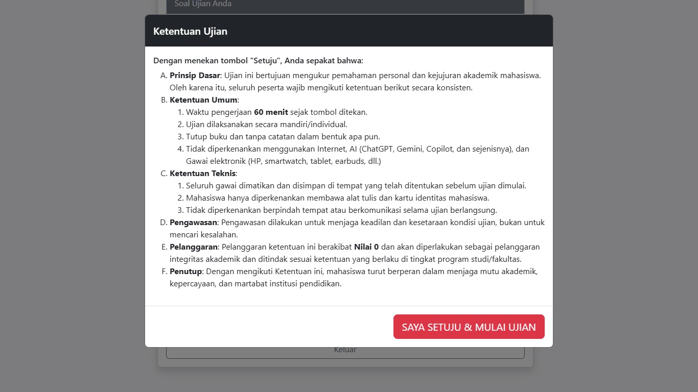 Di era kecerdasan artifisial (AI) generatif yang mudah didapat, seperti ChatGPT atau Deepseek, jawaban ujian dapat diselesaikan dalam hitungan detik. Padahal, sudah terang ujian bersifat closed-book (tutup buku) dan tutup internet. Ini bukan sekadar teknis, melainkan ujian karakter.