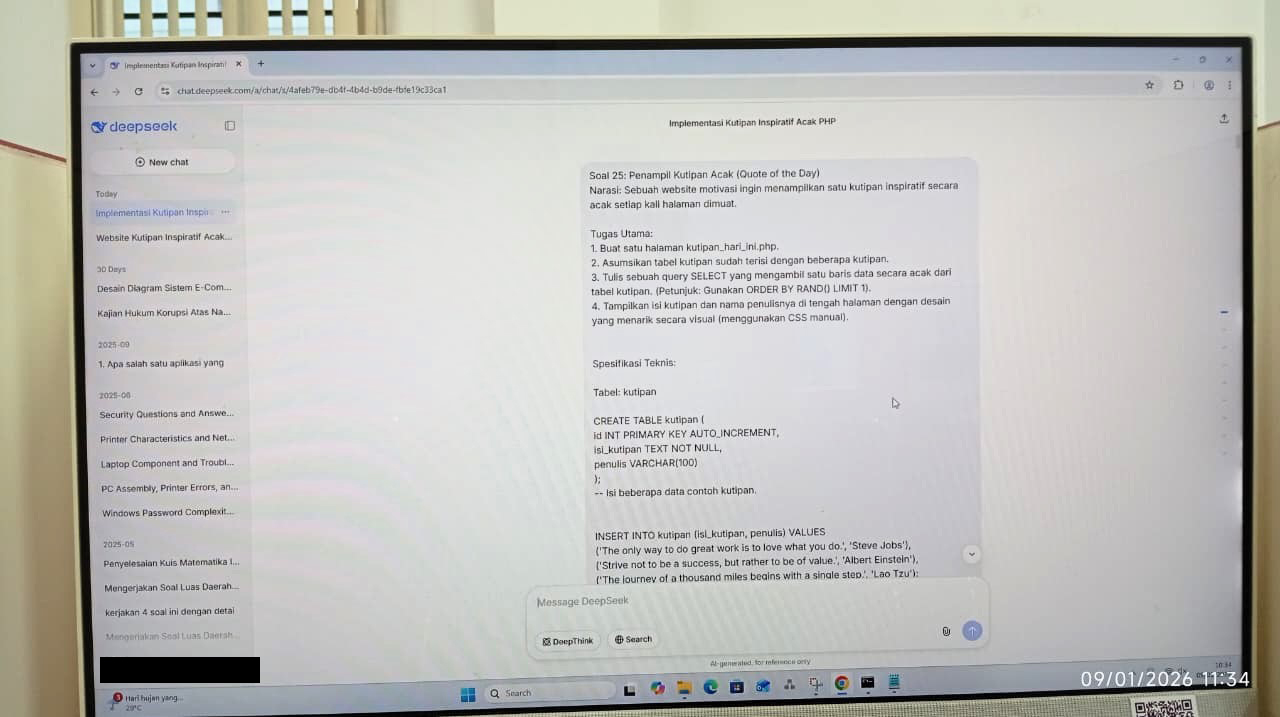 Baru saja saya menyelesaikan koreksi ujian akhir semester Ganjil 2025/2026. Di depan layar, saya tidak hanya melihat baris-baris perintah PHP, struktur SQL, dan tangkapan layar (screenshot) hasil eksekusi program. Lebih dari itu, saya melihat “jejak” cara berpikir, perjuangan, dan yang paling penting pilihan integritas.